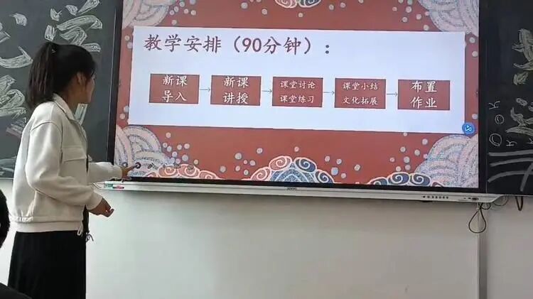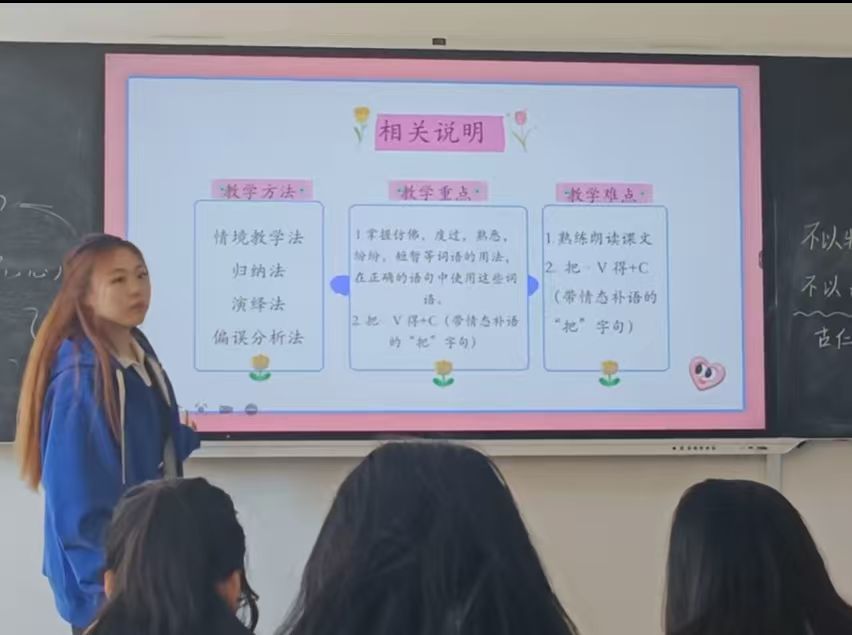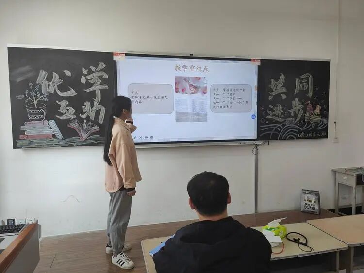 汇报过程中,同学们还模拟了与学生的互动环节。他们巧妙地运用教学话术,引导学生积极思考、勇于表达,让课堂成为了学生展示自我、交流思想的平台。这种模拟互动不仅让在场的同学们感受到了真实的教学场景,也让他们深刻体会到了教学工作的挑战与乐趣。、