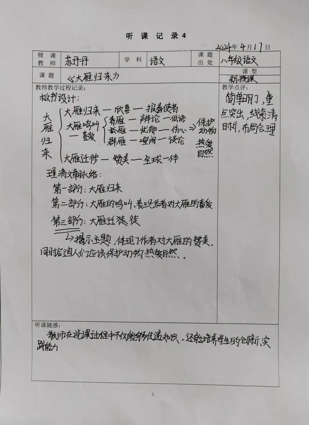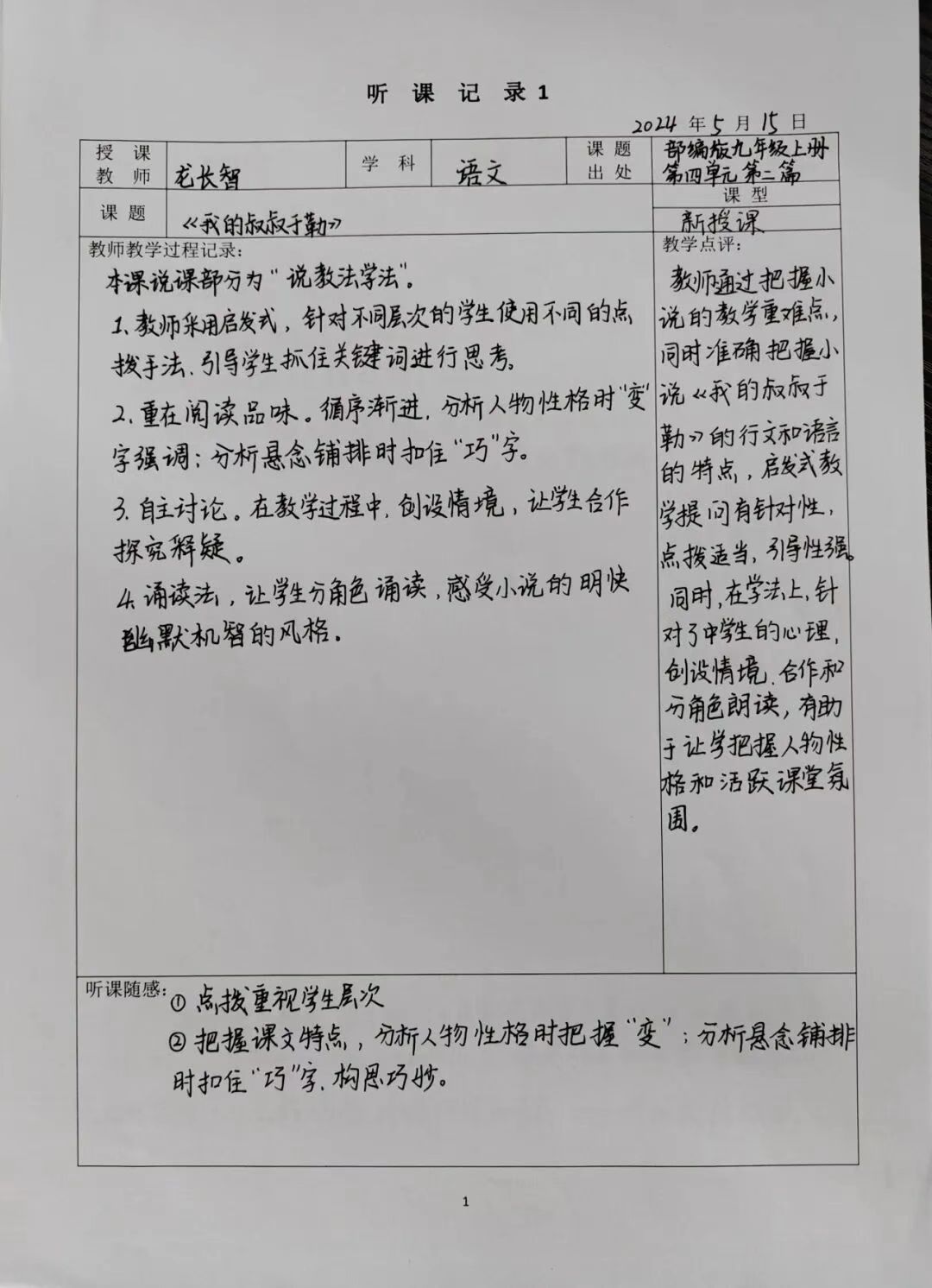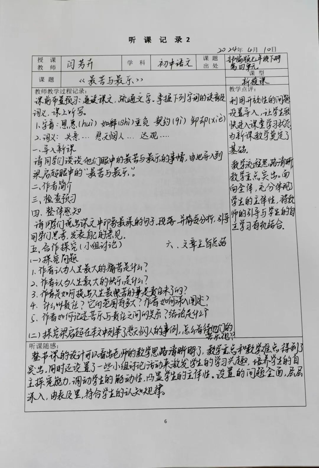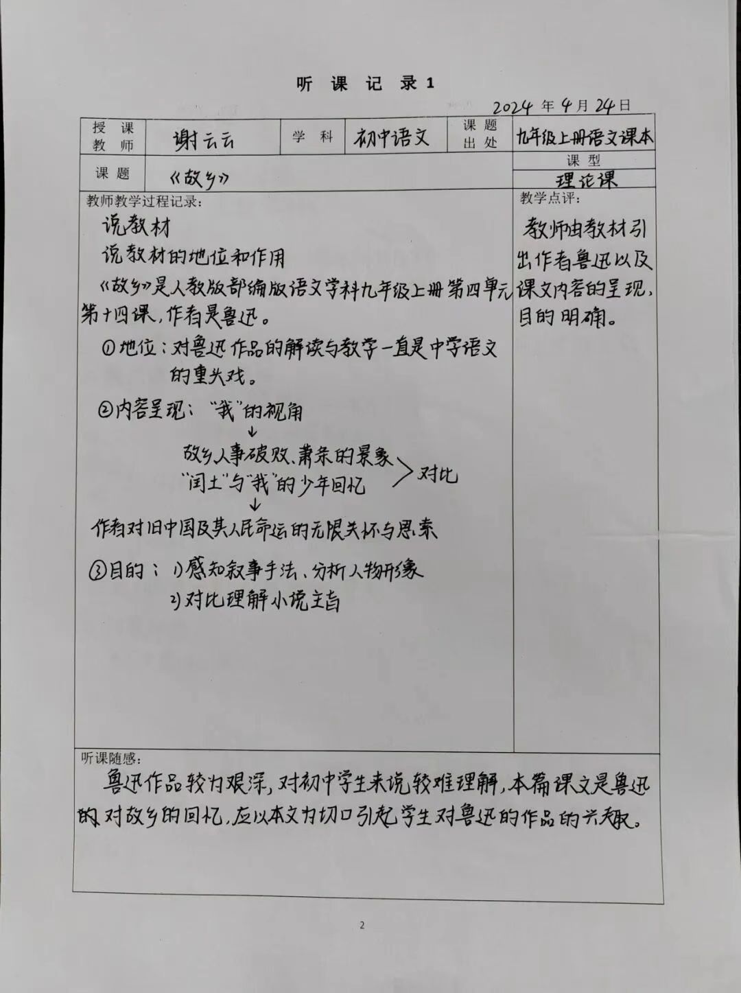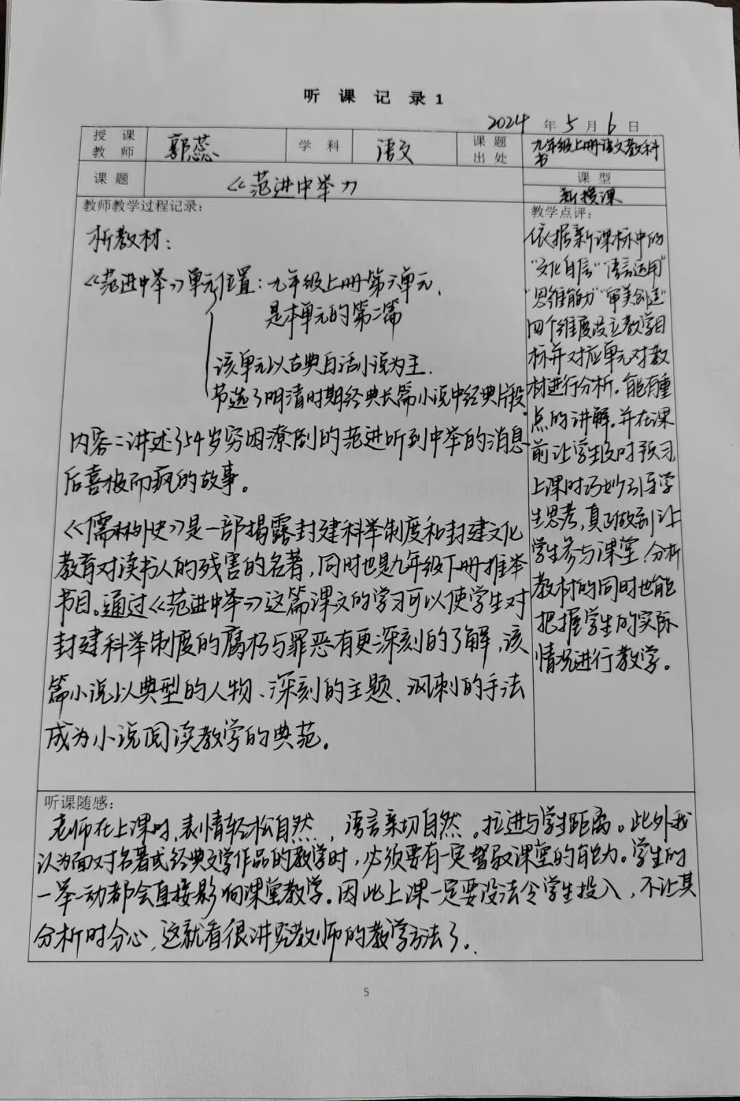 在“教”的层面,关注学生说课的教学设计环节是否完整,重难点问题是否得到解决,旧知与新知过渡是否自然合理,作业安排是否适当;在“学”的层面,关注课程设计与教学内容是否符合初中生对知识的接纳与认知规律,是否兼顾了实现知识目标与对学生核心素养的提升;在“评”的层面,则倾向于正面激励,鼓励自我反思及同伴间的互助评价,每位参与者需提交五份听课反馈,以此促进相互学习。