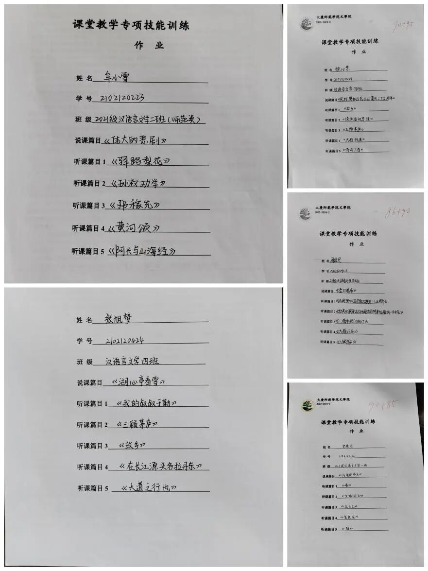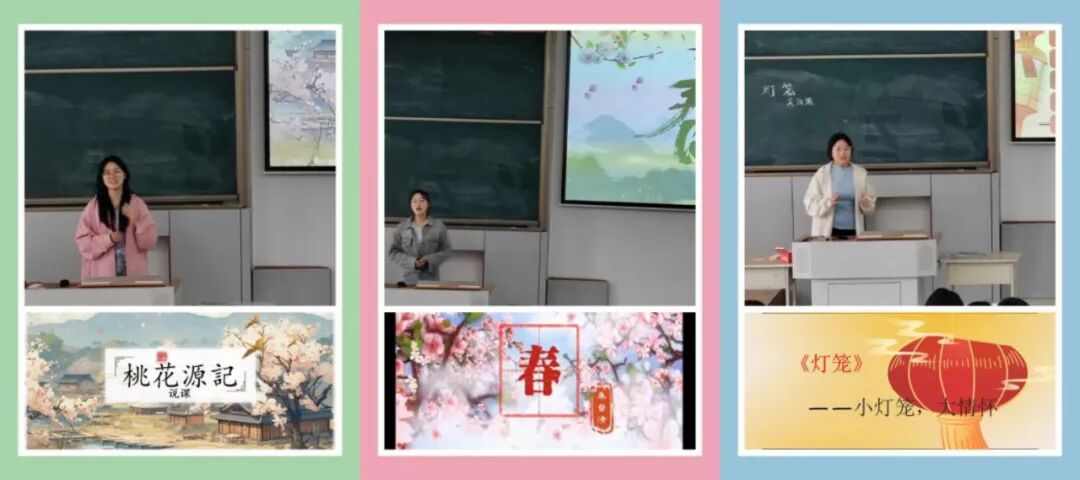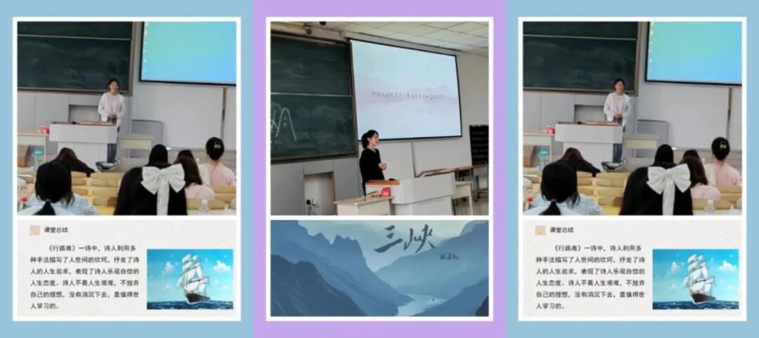 二是实战演练环节精彩纷呈。六位表现优秀的同学展示了她们的授课风采。王一然同学讲授《三峡》(郦道元),冯婧同学讲授《行路难》(李白),谢云云同学讲授《紫藤萝瀑布》(宗璞),邢晋同学讲授《灯笼》(吴伯萧),夏婉茹同学讲授《春》(朱自清),邹欣欣同学讲授《桃花源记》(陶渊明)。